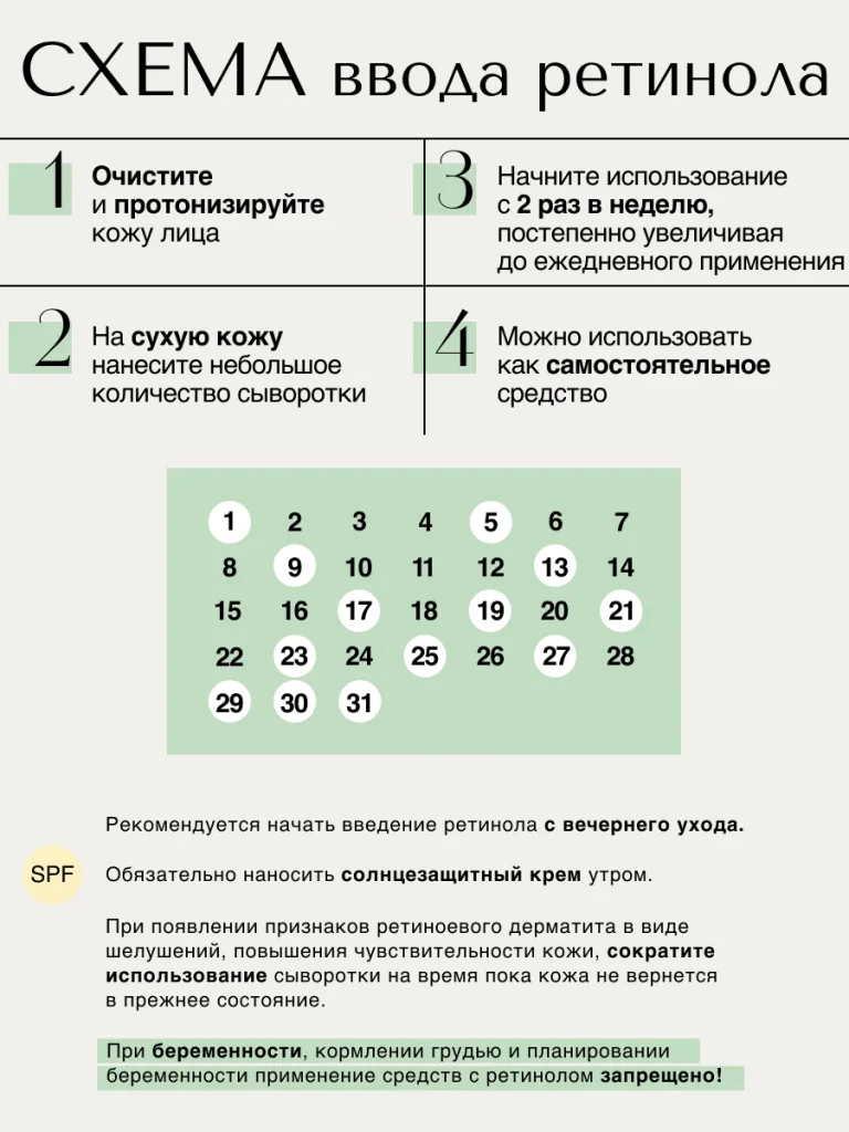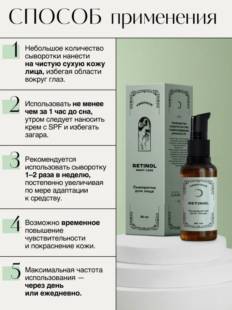 Начинать использование с 1–2 раз в неделю, постепенно увеличивая периодичность по мере адаптации. Возможно временное повышение чувствительности и покраснение кожи. Максимальная частота использования — через день или ежедневно.