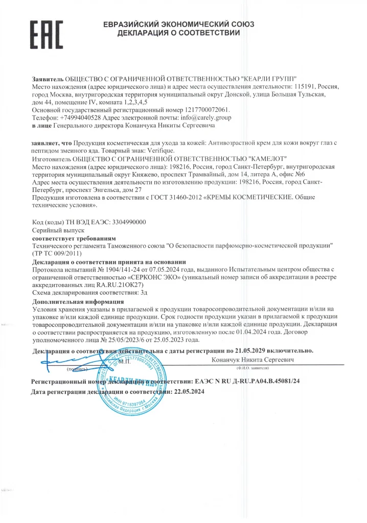 Крем для деликатной зоны вокруг глаз разработан таким образом, чтобы ухаживать за возрастной кожей, но при этом не оказывать излишне утяжеляющий эффект. Пептид змеиного яда в сочетании с нейро октапептидом эффективно и безопасно воздействуют на повышенную мимику, препятствуя образованию заломов. Дезамидо коллаген способствует лифтинг эффекту и усиливает уплотняющее воздействие на истонченные участки. Экстракт красных водорослей и кофеин снимают следы усталости. Масла ши и грецкого ореха питают нежную кожу вокруг глаз
