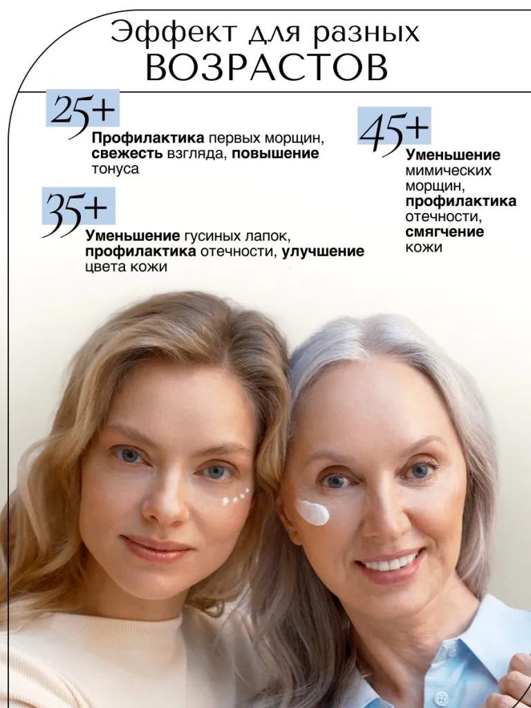 Возрастная кожа истощается и не может самовосполнять себя необходимыми ей веществами, а также удерживать компоненты. Коррекция возможна только при использовании антивозрастного компонента в рабочей дозировке два раза в сутки.