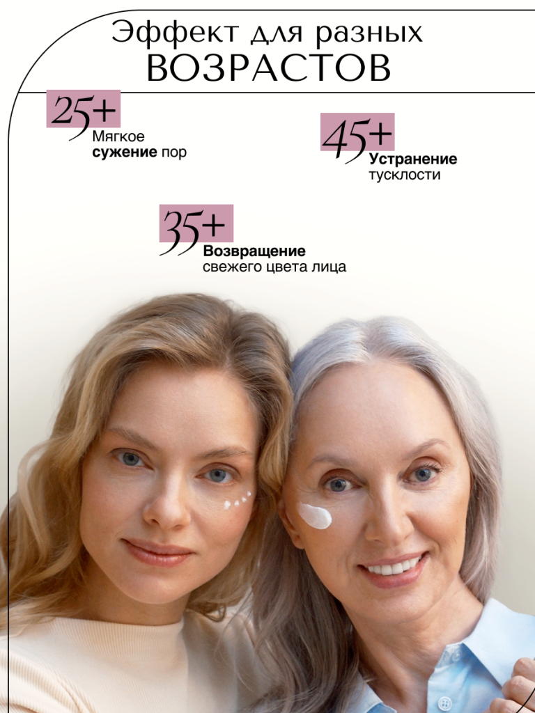 Возрастная кожа истощается и не может самовосполнять себя необходимыми ей веществами, а также удерживать компоненты. Коррекция возможна только при использовании антивозрастного компонента в рабочей дозировке два раза в сутки.