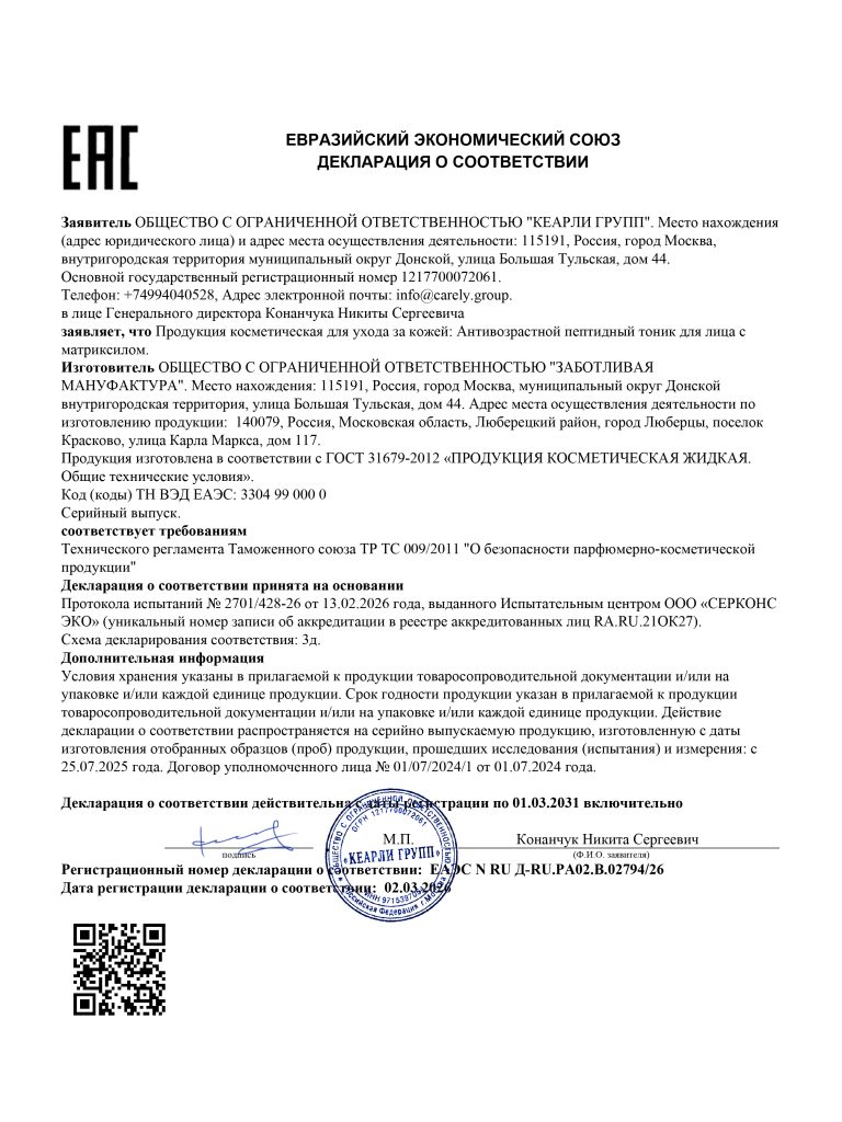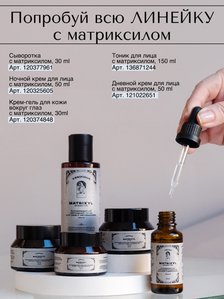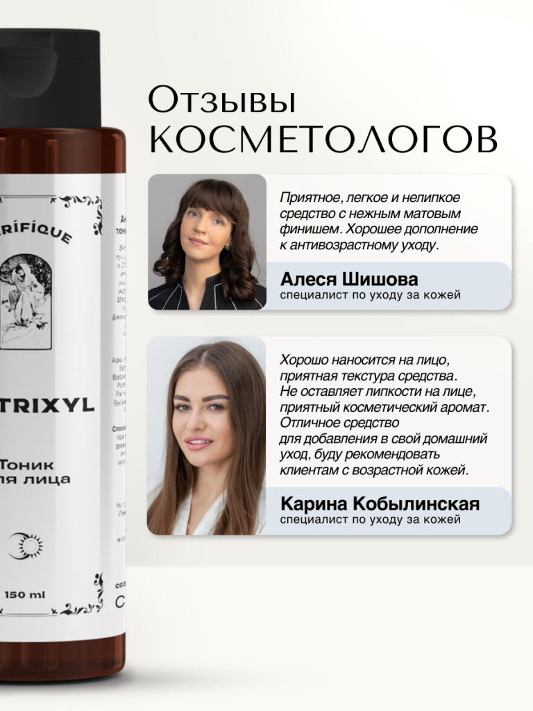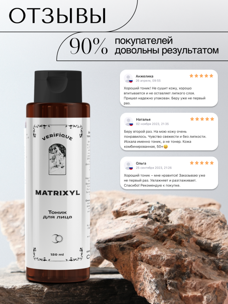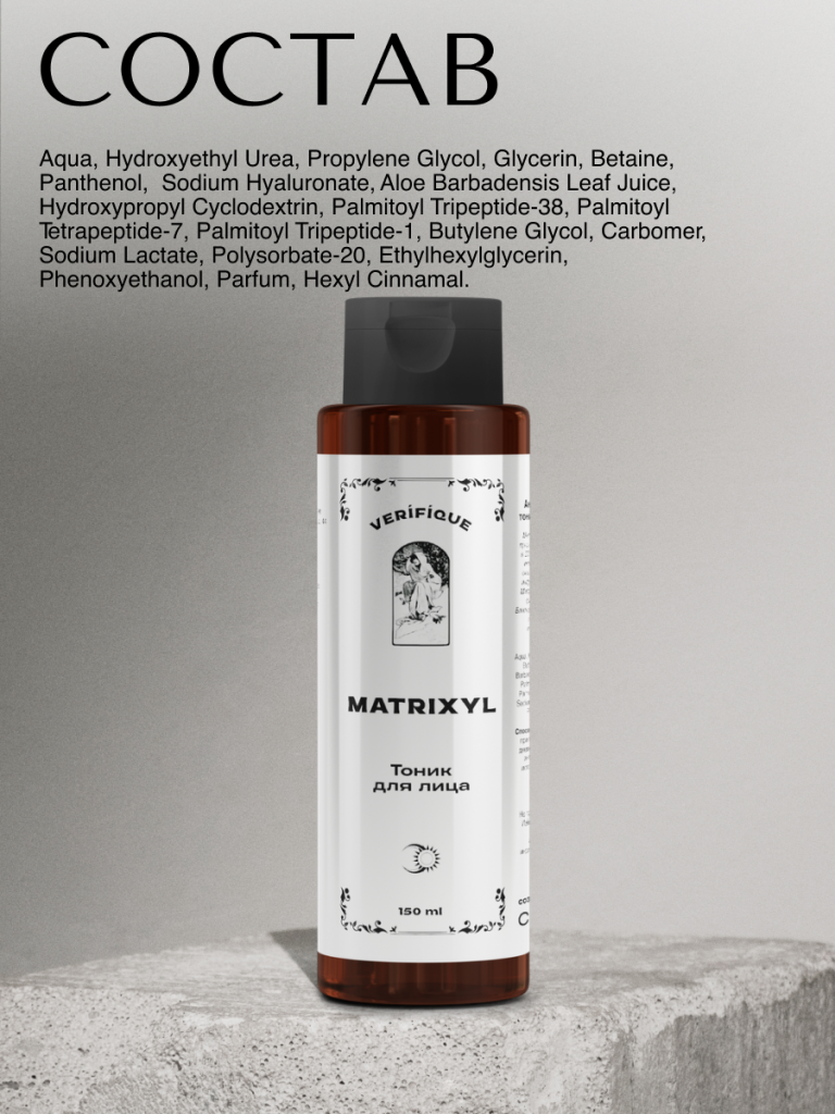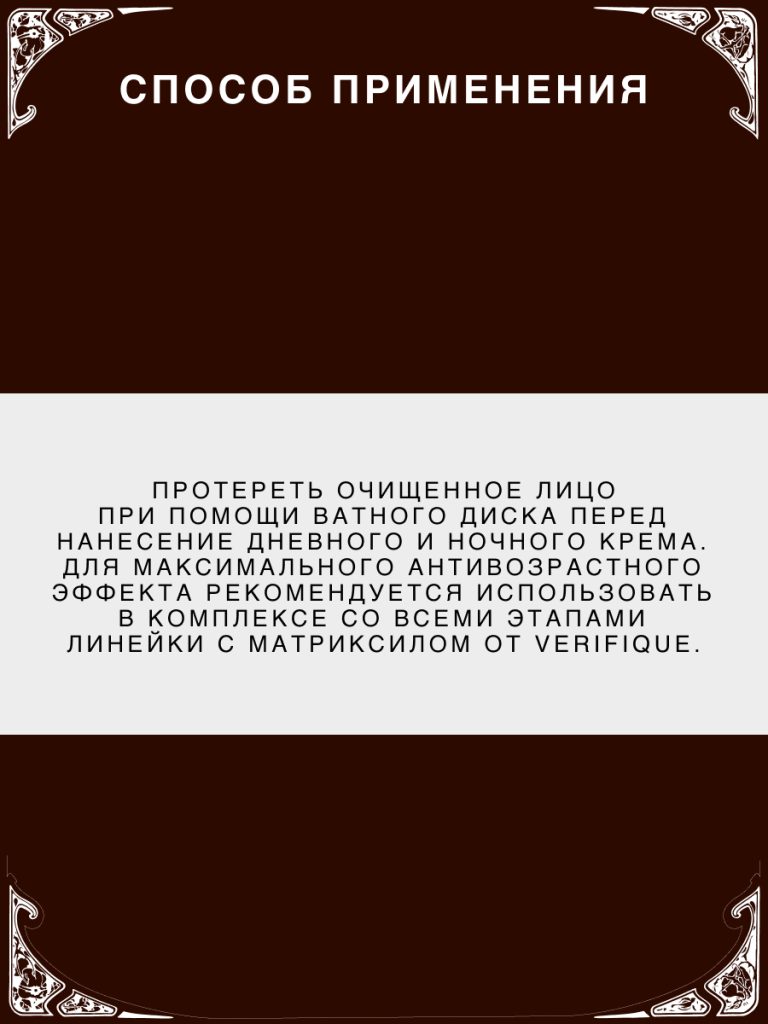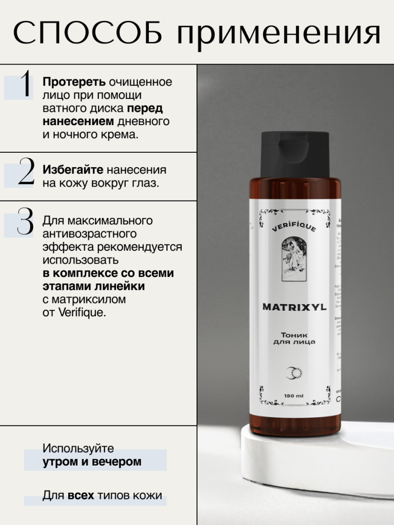 Антивозрастной тоник оказывает глубоко увлажняющий, наполняющий эффект и способствует активному уменьшению морщин. Матриксил — пептидный компонент, который стимулирует главные компоненты матрикса кожи, обеспечивает гладкость и упругость кожи, а также усиливает антивозрастные действия дневного и ночного крема. Сок алое в сочетании с карбамидом устраняет дискомфорт, шелушения и нормализовывает ph после контакта с водопроводной водой.