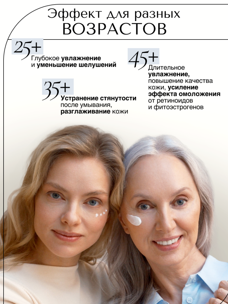 Возрастная кожа истощается и не может самовосполнять себя необходимыми ей веществами, а также удерживать компоненты. Коррекция возможна только при использовании антивозрастного компонента в рабочей дозировке два раза в сутки.