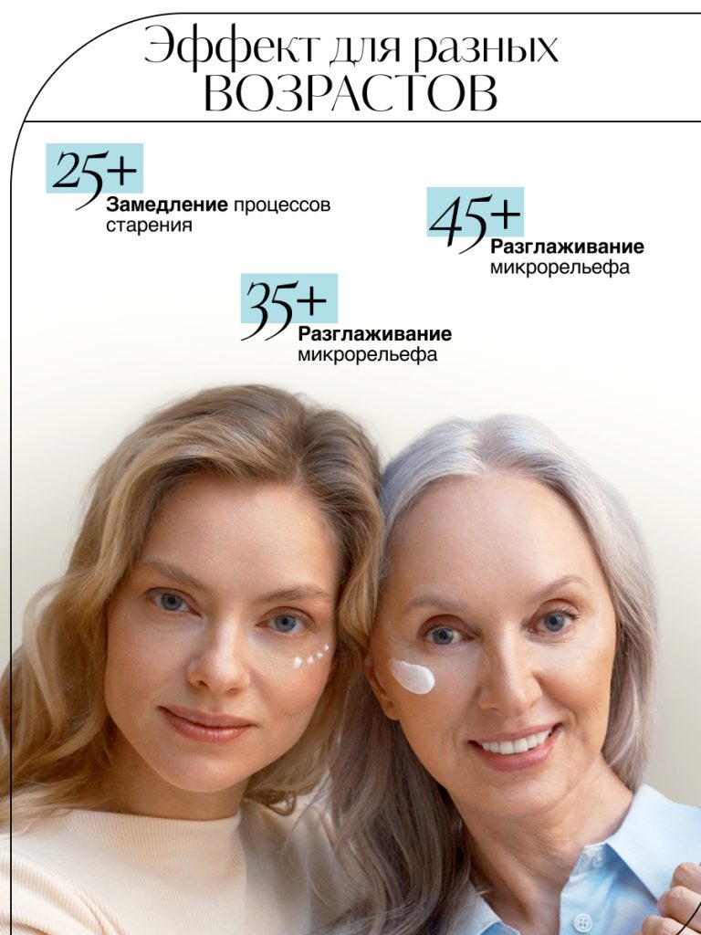 Возрастная кожа истощается и не может самовосполнять себя необходимыми ей веществами, а также удерживать компоненты. Коррекция возможна только при использовании антивозрастного компонента в рабочей дозировке два раза в сутки.