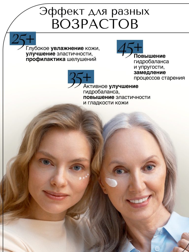 Возрастная кожа истощается и не может самовосполнять себя необходимыми ей веществами, а также удерживать компоненты. Коррекция возможна только при использовании антивозрастного компонента в рабочей дозировке два раза в сутки.