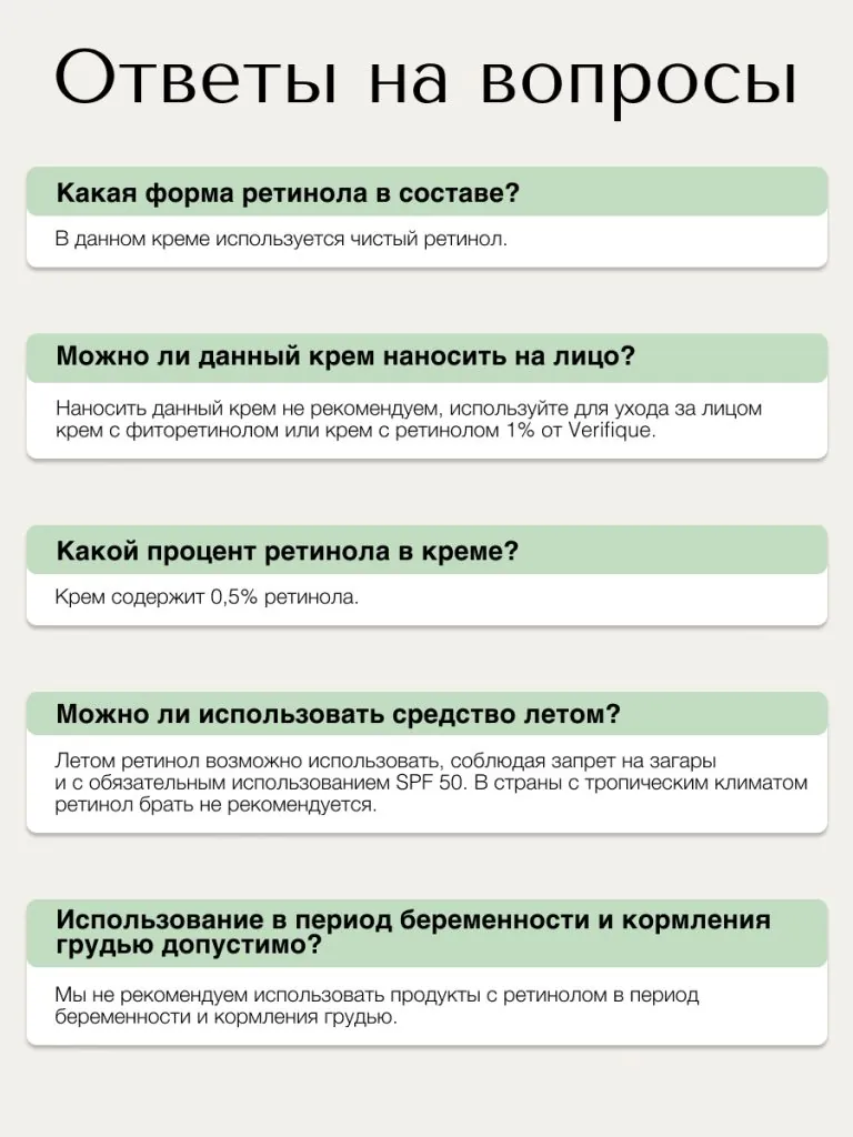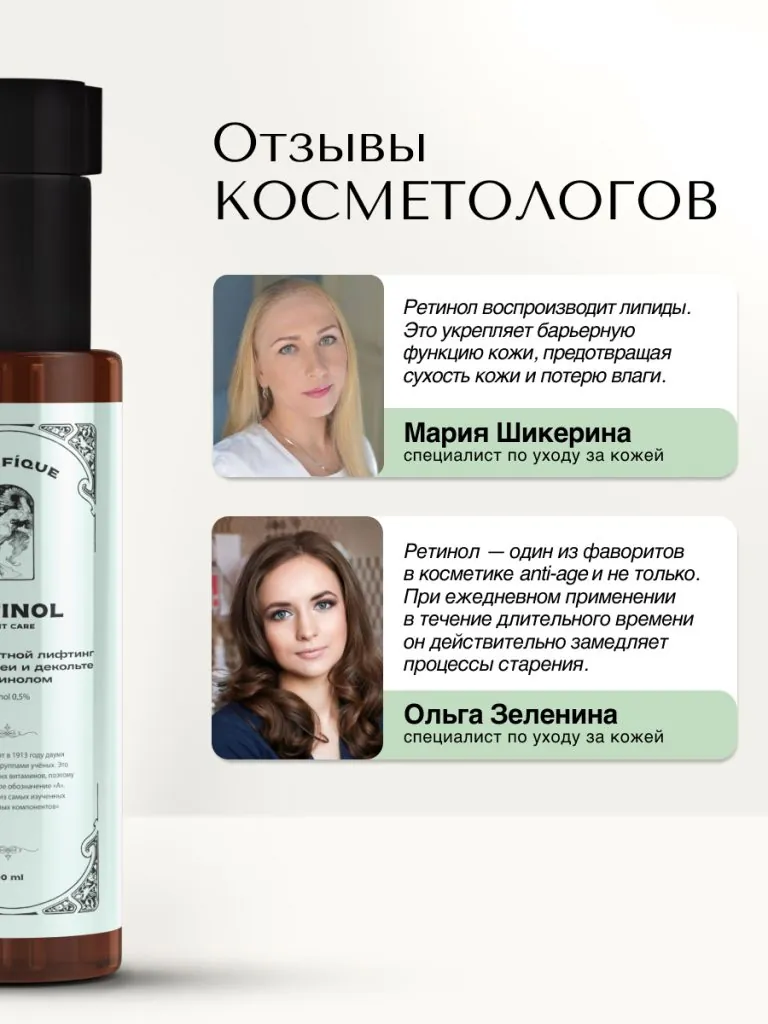 Перед первым использованием продуктов с ретинолом рекомендуется провести кожную пробу на локтевом сгибе. Допускается не длительное покраснение, ощущение разогретой кожи, которое будет исчезать по мере адаптации к средству.