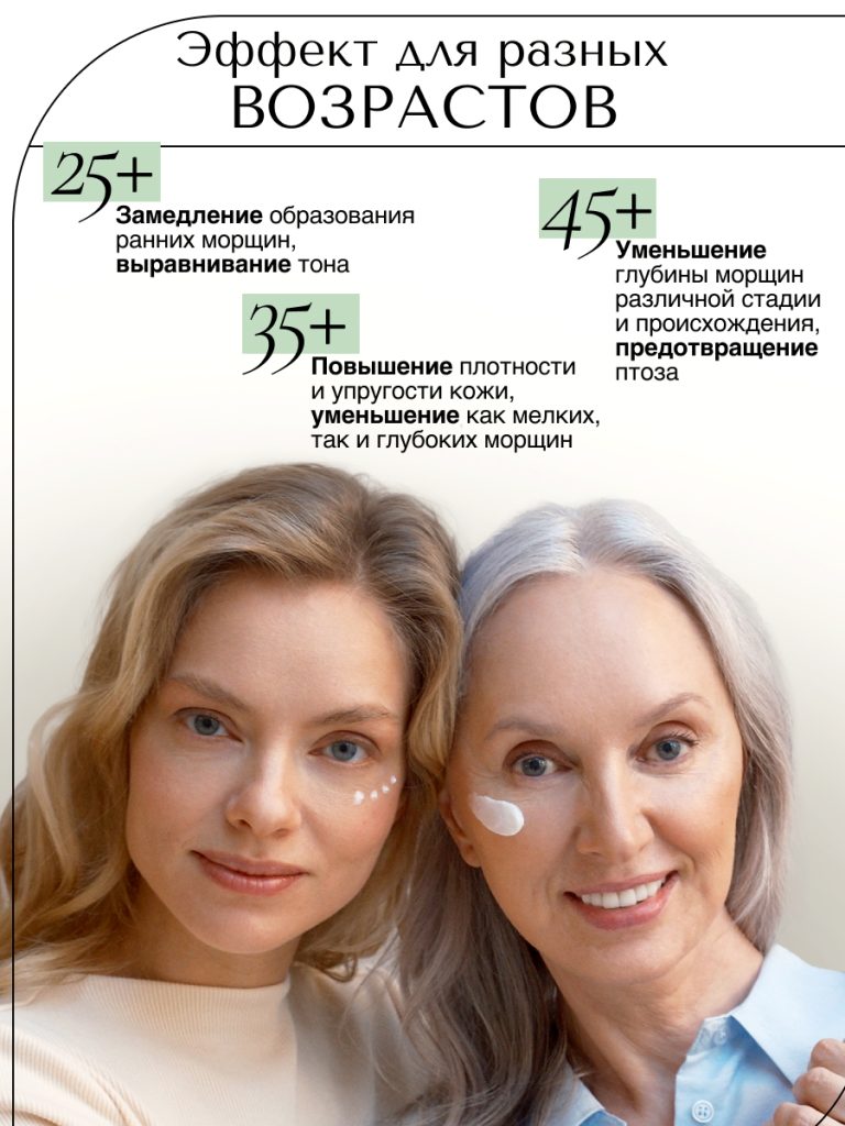 Возрастная кожа истощается и не может самовосполнять себя необходимыми ей веществами, а также удерживать компоненты. Коррекция возможна только при использовании антивозрастного компонента в рабочей дозировке два раза в сутки.