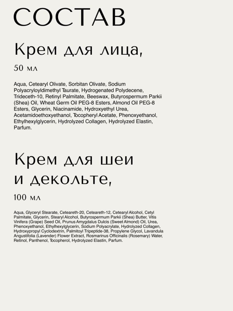 1. Антивозрастной крем для лица с ретинолом, 50 мл:Aqua, Cetearyl Olivate, Sorbitan Olivate, Sodium Polyacryloyldimethyl Taurate, Hydrogenated Polydecene, Trideceth-10, Retinol Palmitate (Vitamin A), Beeswax, Shea Butter, Wheat Germ Oil PEG-8 Esters, Almond Oil PEG-8 Esters, Glycerin, Niacinamide, Hydroxyethyl Urea, Acetamidoethoxyethanol, Tocopherol Acetate (Vitamin E), Benzyl Alcohol, Ethylhexylglycerin, Hydrolyzed Collagen, Hydrolyzed Elastin, Parfum