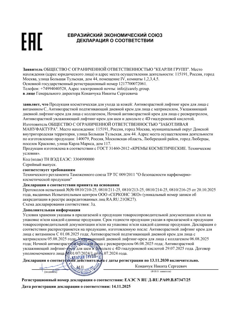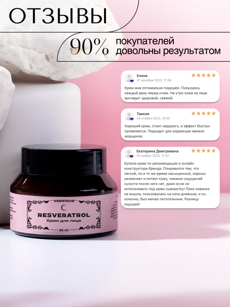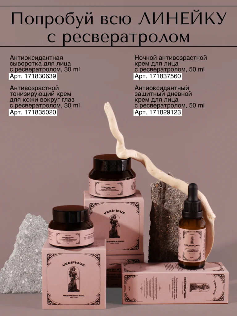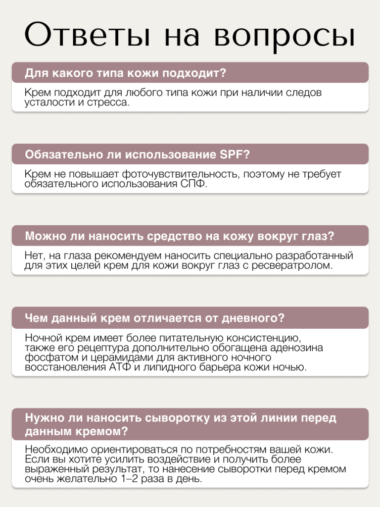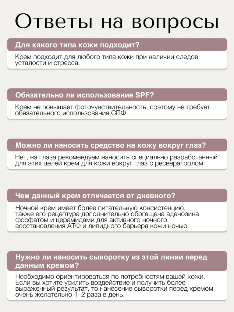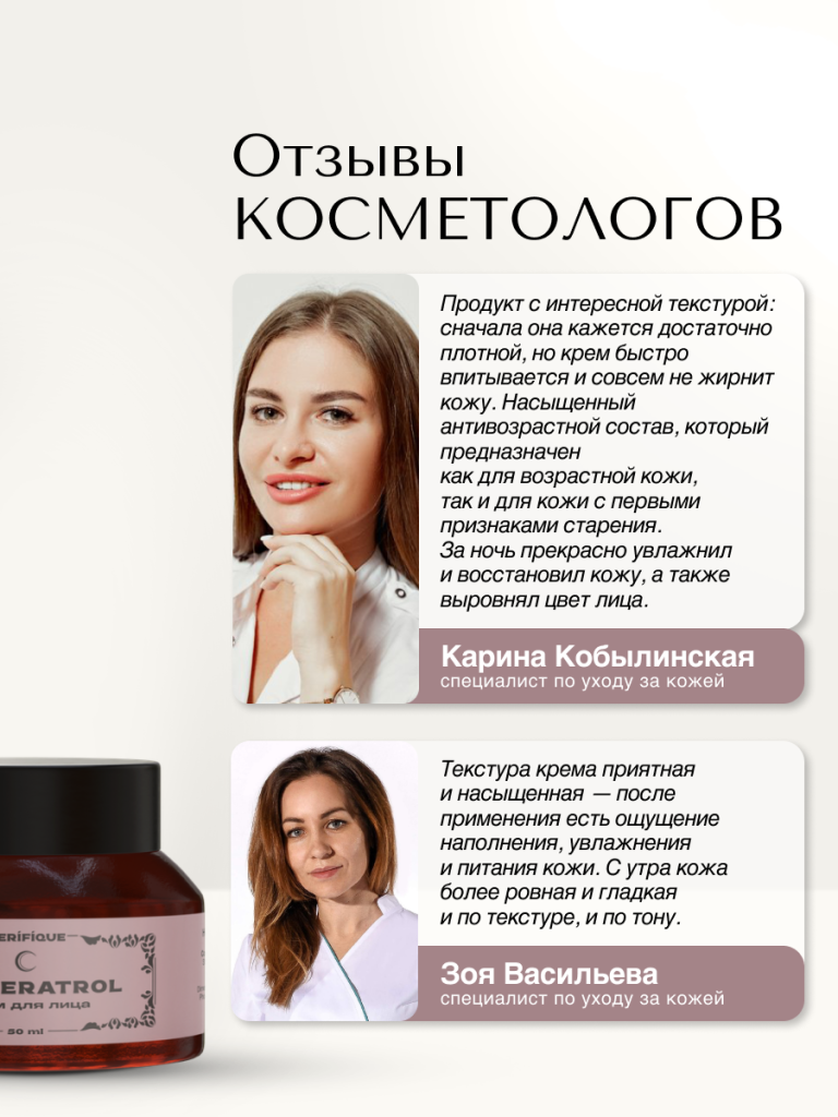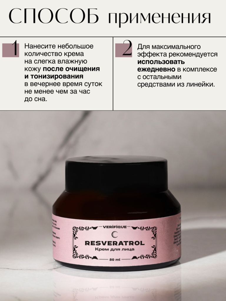 Ресвератрол защищает собственный коллаген и эластин от возрастного разрушения. DMAE (диметиламиноэтанол тартрат) способствует улучшению тонуса и упругости кожи. Гидролизованный коллаген разглаживает мелкие морщинки и увлажняет кожу. Масло асаи восстанавливает кожу в течение ночи и устраняет последствия дневного стресса. Церамидный комплекс восстанавливает и укрепляет кожный барьер. В результате крем обеспечивает здоровый цвет лица, комфортное питание кожи и помогает уменьшить первые признаки старения.