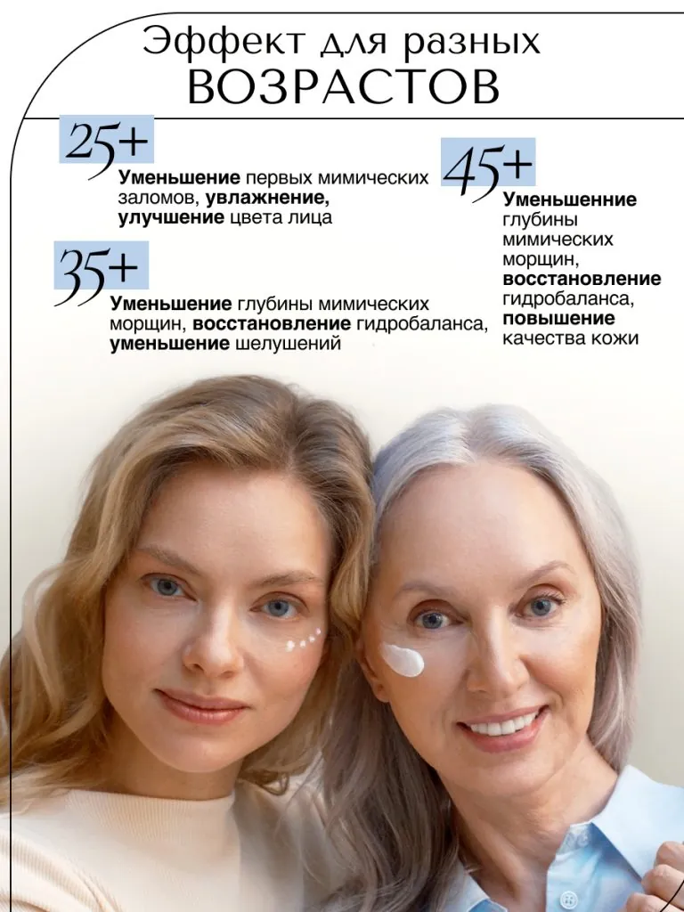 Возрастная кожа истощается и не может самовосполнять себя необходимыми ей веществами, а также удерживать компоненты. Коррекция возможна только при использовании антивозрастного компонента в рабочей дозировке два раза в сутки.