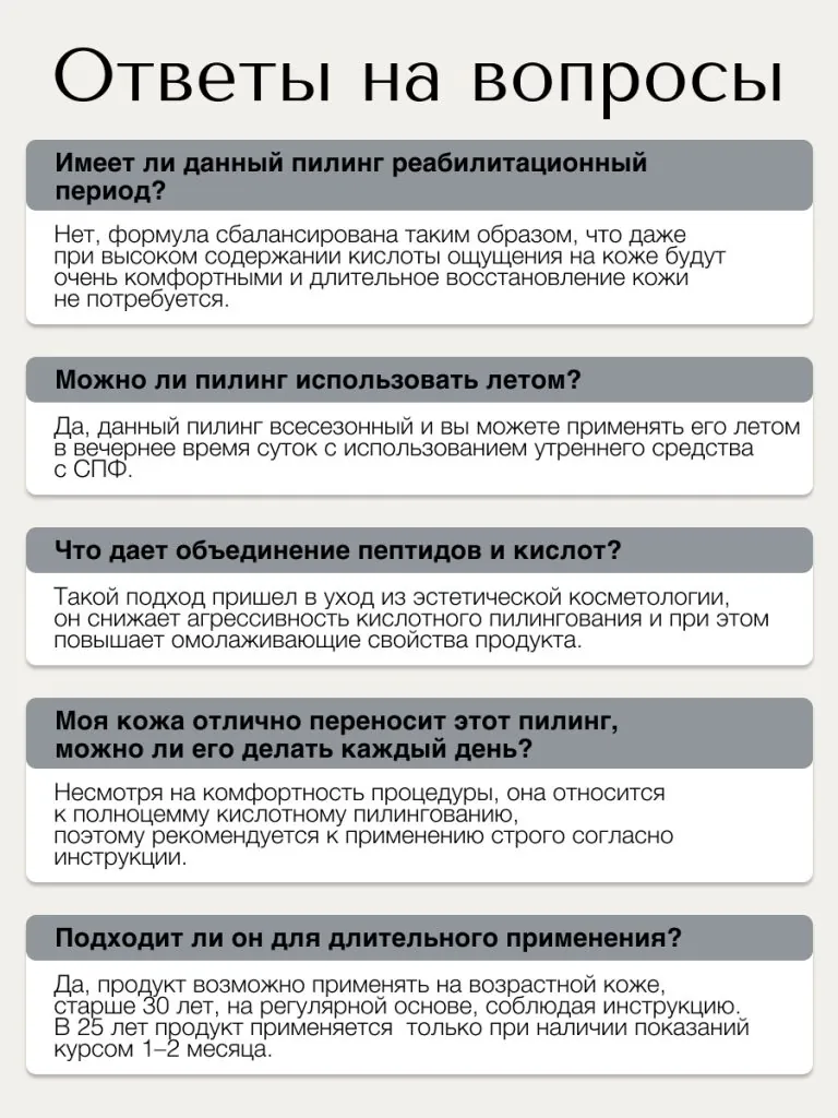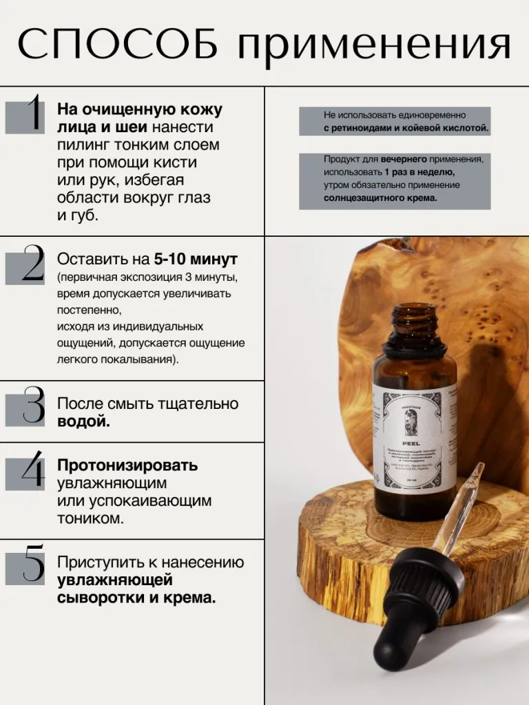 Благодаря молочно-гликолевой основе пилинг способствует отшелушиванию омертвевших клеток, уменьшению проявления признаков старения и повышению упругости кожи. Янтарная кислота обеспечивает эффект здорового сияния и гладкости эпидермиса. Пептидные комплексы воздействуют на морщины: как на мимические, так и на уже сформировавшиеся. Гиалуроновая кислота помогает избежать пересушивания, а также обеспечивает мягкость воздействия пилинга. Таким образом, пилинг поможет добиться выраженного омолаживающего результата и уменьшения проявления морщин. Не использовать при выраженных высыпаниях и поврежденной коже. Продукт подходит для всесезонного применения.