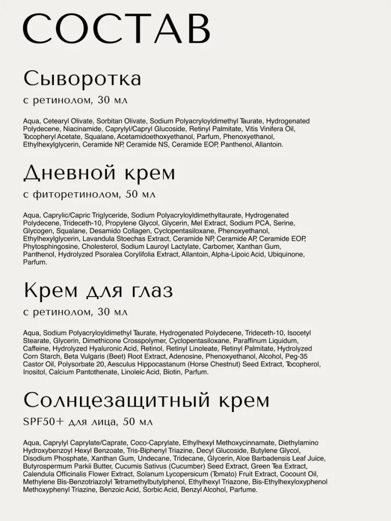 4. Антивозрастная сыворотка для лица с ретинолом 1%: Aqua, Cetearyl Olivate, Sorbitan Olivate, Sodium Polyacryloyldimethyl Taurate, Hydrogenated Polydecene, Niacinamide, Caprylyl/Capryl Glucoside, Retinyl Palmitate, Vitis Vinifera Oil, Tocopheryl Acetate, Squalane, Acetamidoethoxyethanol, Parfum, Phenoxyethanol, Ethylhexylglycerin, Ceramide NP, Ceramide NS, Ceramide EOP, Panthenol, Allantoin.