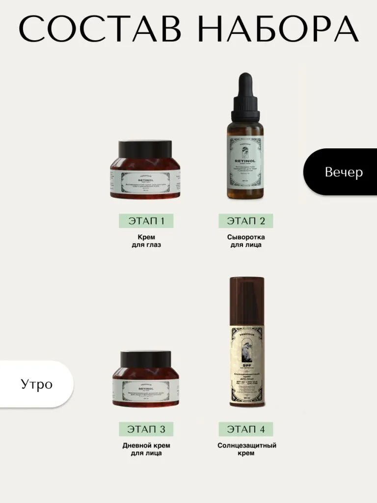 Рекомендованная длительность применения набора ретиноловых средств составляет 3–6 месяцев.