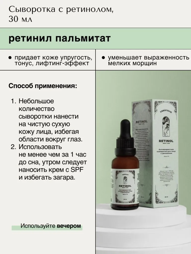 Ретинол пальмитат уменьшает глубину морщин и способствует разглаживанию кожи, склонной к огрубеванию и сморщиванию, эффективно борется с последствиями фотостарения и улучшает тон. В результате сыворотка оказывает интенсивное омолаживающее действие, проникая в глубокие слои кожи.