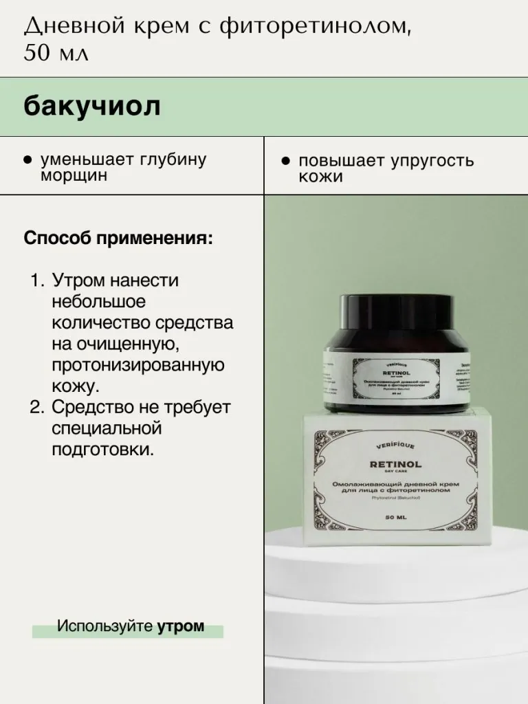 Утром на очищенную и протонизированную кожу лица ежедневно наносите дневной крем с фиторетинолом.
