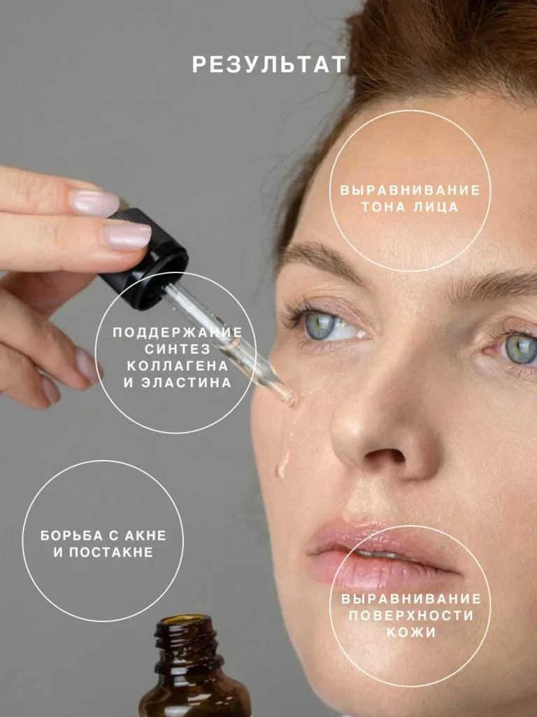 Ретинол — стимулирует работу клеток и ускоряет обменные процессы в них, повышает регенерацию кожи, снижает пигментацию и воспалительные процессы, борется с признаками фотостарения, улучшает текстуру кожи и разглаживает мелкие морщинки. Ниацинамид эффективно борется с морщинами, выравнивая кожу и улучшая ее эластичность. Фосфолипиды — улучшают барьерные функции кожи, восстанавливают повреждения в коже.