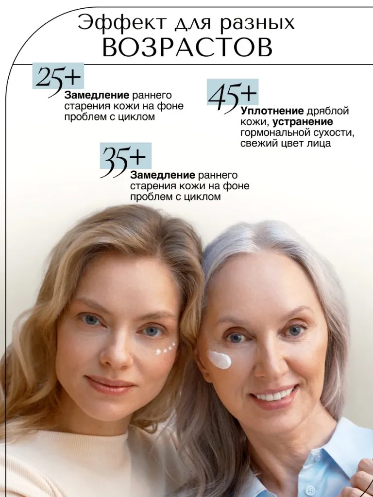 Возрастная кожа истощается и не может самовосполнять себя необходимыми ей веществами, а также удерживать компоненты. Коррекция возможна только при использовании антивозрастного компонента в рабочей дозировке два раза в сутки.