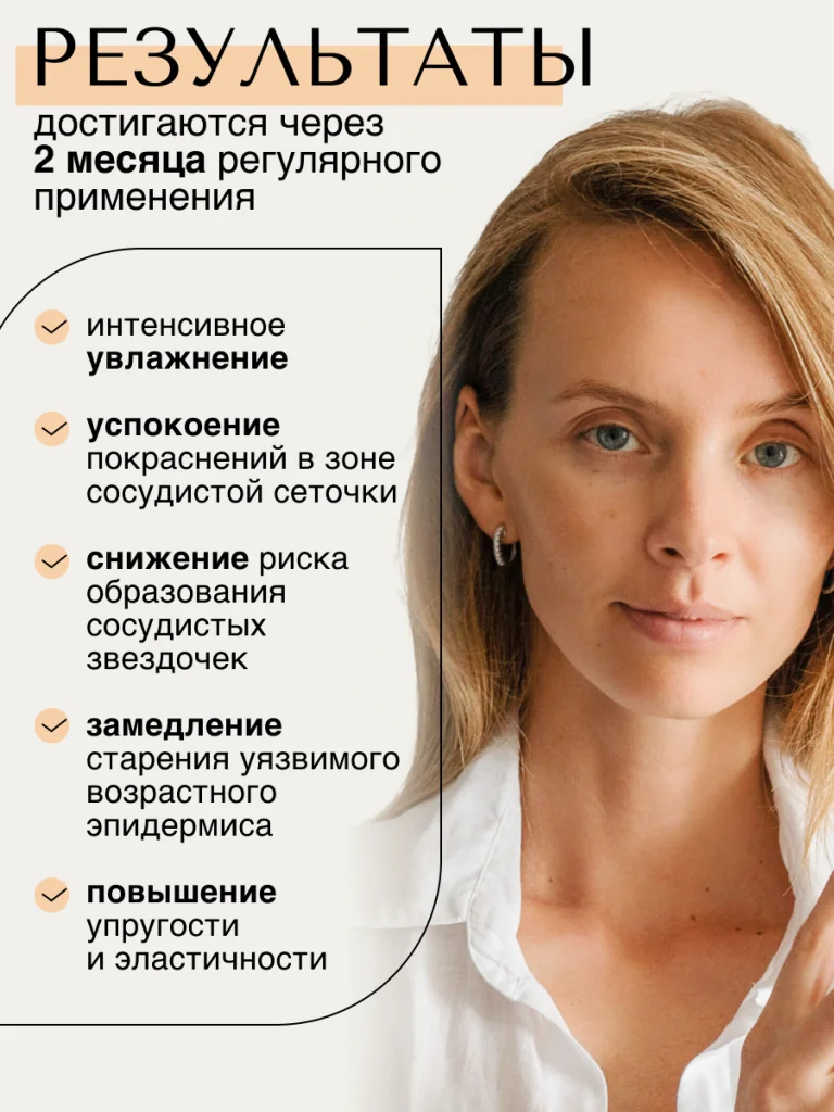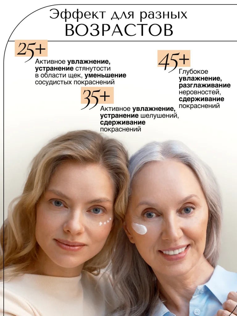 Возрастная кожа истощается и не может самовосполнять себя необходимыми ей веществами, а также удерживать компоненты. Коррекция возможна только при использовании антивозрастного компонента в рабочей дозировке два раза в сутки.